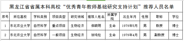 根据黑龙江省教育厅下发的《黑龙江省省属本科高校“优秀青年教师基础研究支持计划”实施办法(试行)》的通知要求,经本人申请、资格审核、专家评审等程序,择优推荐以下2人参评2023年黑龙江省省属本科高校“优秀青年教师基础研究支持计划”项目,名单公示如下: