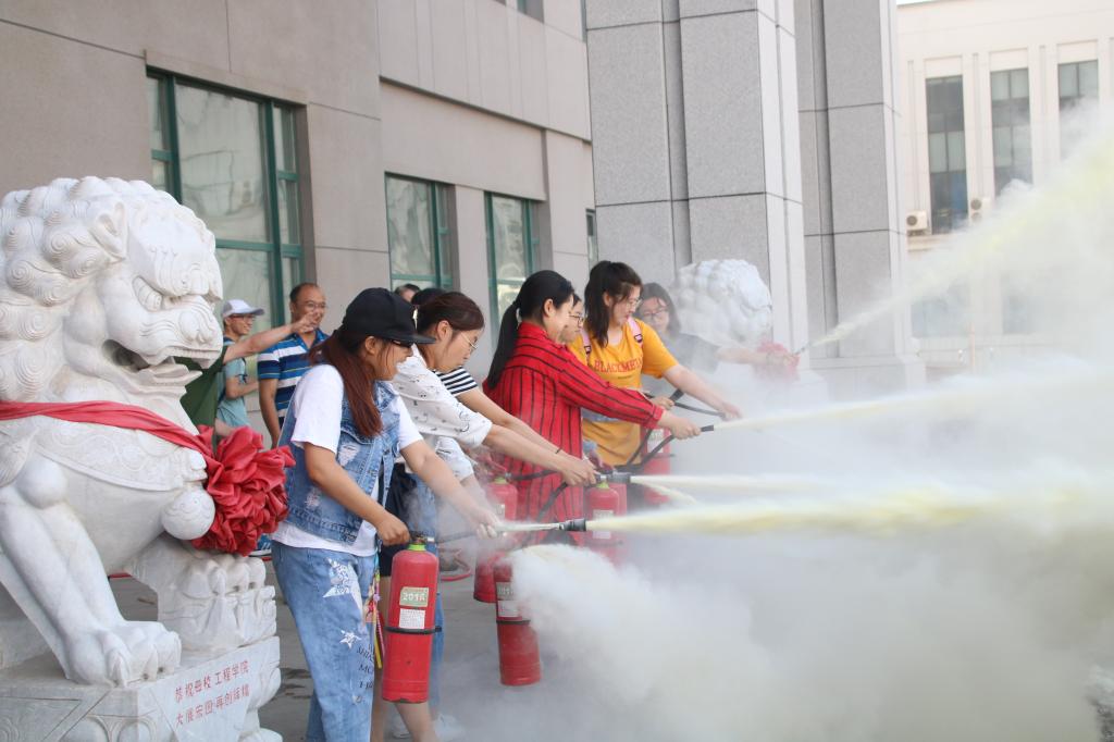 随后,保卫处工作人员现场演示了消防水龙头的喷淋以及干粉灭火器的使用方法,并指导学生如何使用消防设施。