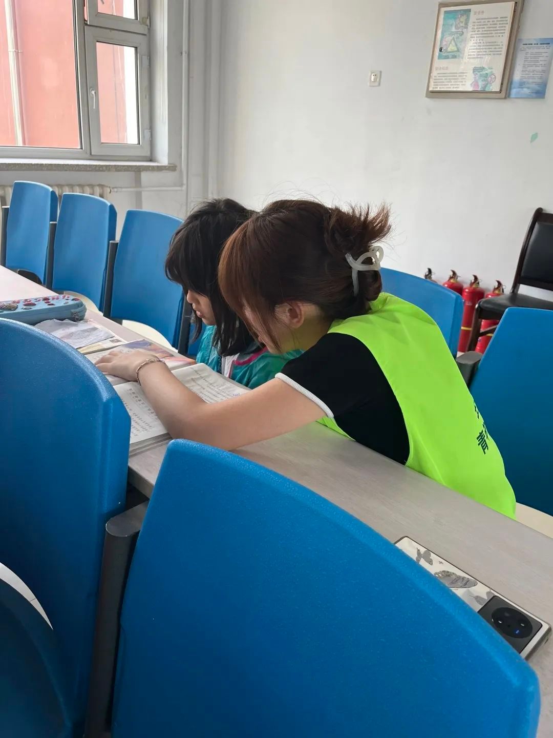上午九点整,志愿者们坐在学校四楼多媒体教室等待着孩子们的到来。伴随着走廊里此起彼伏的欢笑声,一张张稚嫩的脸庞映入志愿者们的眼帘。等待志愿者们都牵好孩子们落座,孩子们纷纷从小书包里拿出作业本和课本,向志愿者们询问作业的问题。
