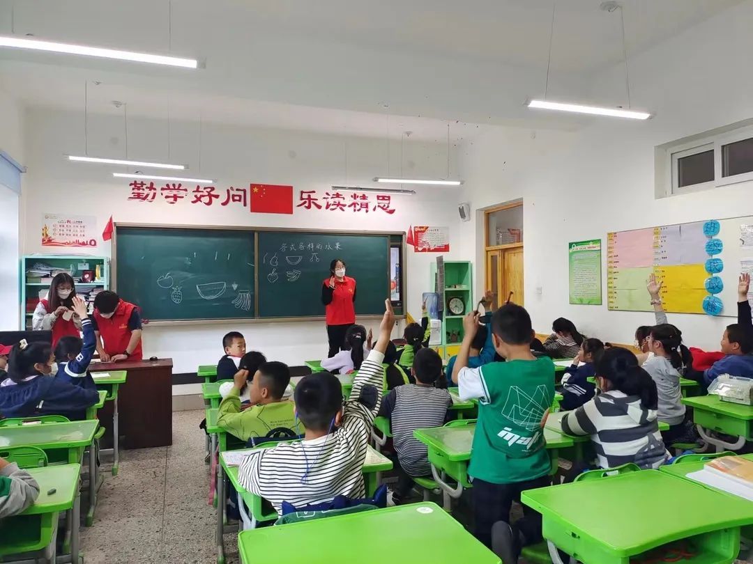 在简单的自我介绍后,志愿者们打开了早早准备好的PPT,为同学们讲解了击鼓传花的游戏方法,同学们兴高采烈,在游戏过程中也积极配合,纷纷自我介绍、背古诗、跳舞等表演了自己的才艺。成功调动了现场气氛后,志愿者向同学们教授了一些水果的画法,同学们热情高涨,争先恐后的讲述自己最喜欢的水果,在一片欢乐的氛围中学会了苹果、葡萄、草莓和樱桃等水果的画法并主动在黑板上展示自己的学习成果。