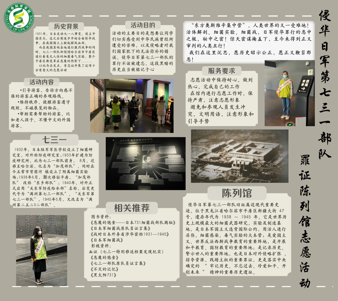 三月,充满朝气的季节,而这朝气却被万物谱写。在春天里,小草探出头儿要张望世界,默默地为大地披上了绿装;树木的嫩芽儿也不甘示弱,争先恐后地冒出来,向世间问好;一切的一切,都有着崭新的面貌。三月的风儿瞬间向我们吹来,带着雨露和清香,也带来了一个名字——雷锋。2023年是学习雷锋第六十年,为贯彻落实习近平总书记的重要指示,由校团委主办、校青年志愿者协会承办的“雷锋精神我传承,青春闪耀新时代”主题志愿服务展览于2023年3月31日在主楼甬道顺利展开。在此期间,2007so太阳集团青志站圆满完成了“侵华日军第七三一部队罪证陈列馆巡导”志愿活动的讲解。此次活动在学生中引发了热烈反响,不仅让中外学生体会到了“雷锋精神”,也进一步使更多人了解抗战时期侵华日军犯下的严重罪行、中国共产党在世界反法西斯战争胜利的牺牲与不可磨灭伟大历史贡献。