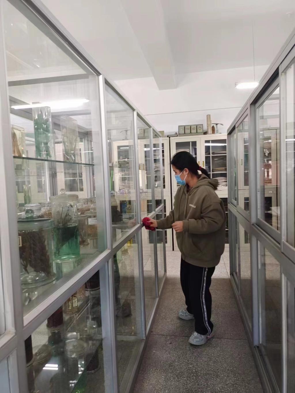 志愿者们热情高涨,干劲十足,积极投身清扫工作中。他们挥舞着扫帚对标本馆的地面进行清扫,清理柜子上的积灰,擦拭柜子、玻璃。
