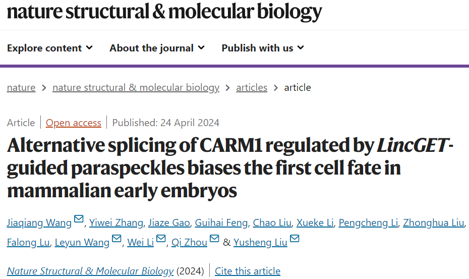 2024年4月24日,多单位研究人员紧密合作,在Nature Structural & Molecular Biology 发表题为“Alternative splicing of CARM1 regulated by LincGET-guided paraspeckles biases the first cell fate in mammalian early embryos”的研究论文,通过对大量RNA-seq数据的分析,他们发现在小鼠2-细胞和4-细胞样本中,Carm1存在明显的异常外显子跳跃剪接现象。进一步的研究证实,CARM1的分子异质性来源于外显子跳跃剪接的异质性,而与转录水平无关。机制研究发现,LincGET组装的paraspeckle与splicing speckle竞争性结合Carm1基因座, 从而导致Carm1 可变剪接的分子异质性,最终造成CARM1蛋白水平的分子异质性,为第一次细胞命运决定奠定了分子基础。该研究不仅阐明了小鼠第一次细胞命运决定中分子异质性形成的机制,还证明了亚细胞核结构在细胞决策中的竞争性参与。这项工作为早期胚胎发育和细胞命运决定等基础研究提供了新的见解和研究方向。