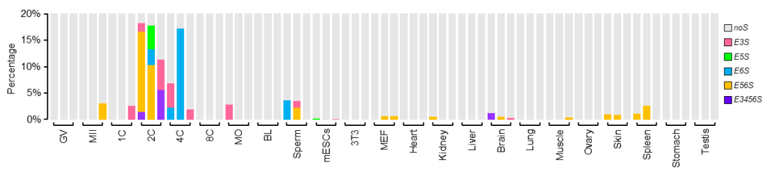 为了揭示小鼠2-细胞至4-细胞时期CARM1分子异质性形成的机制,研究人员对公共数据库中的小鼠早期胚胎样本、细胞/组织样本的RNA-seq数据进行了详细的分析。令人惊讶的是,他们发现了一个在小鼠2-细胞和4-细胞中非常特异的现象——编码CARM1核心功能域的外显子3至外显子6存在非常明显且特异的异常外显子跳跃剪接现象(图1)。这一发现为进一步研究CARM1的分子异质性建立机制提供了重要线索。