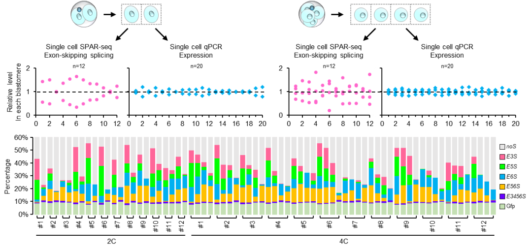 随后,研究人员采用单细胞SPAR-seq、单细胞qPCR,对Carm1 外显子3至6跳跃剪接以及转录水平在小鼠2-细胞和4-细胞卵裂球中的异质性进行了深入分析。他们的结果表明,CARM1的分子异质性主要来源于外显子3至6的跳跃剪接,而与转录水平无关(图2)。这一发现揭示了CARM1分子异质性形成的新机制。