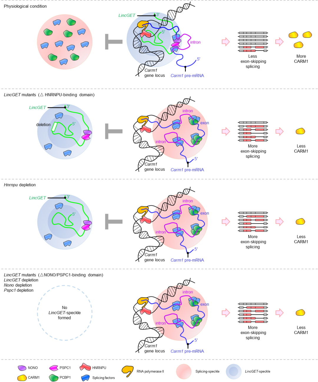 为了进一步揭示CARM1可变剪接异质性形成的机制,研究人员对参与可变剪接调控以及细胞命运决定的LincGET和亚细胞核结构paraspeckle进行了深入研究。他们发现,LincGET参与早期胚胎特异的paraspeckle的组装,并通过与HNRNPU相互作用,将paraspeckle定位到Carm1的基因座上,从而抑制了Carm1的外显子跳跃剪接。此外,通过对Carm1内含子序列的分析,研究人员还发现PCBP1参与的splicing speckle 对Carm1的外显子跳跃剪接起到特异性的促进作用。换句话说,LincGET参与的paraspeckle与PCBP1参与的splicing speckle之间存在竞争性,相互拮抗地调控Carm1的外显子跳跃剪接,决定了Carm1可变剪接水平的异质性(图3)。这一发现为深入理解CARM1分子异质性的形成机制提供了新的理论。