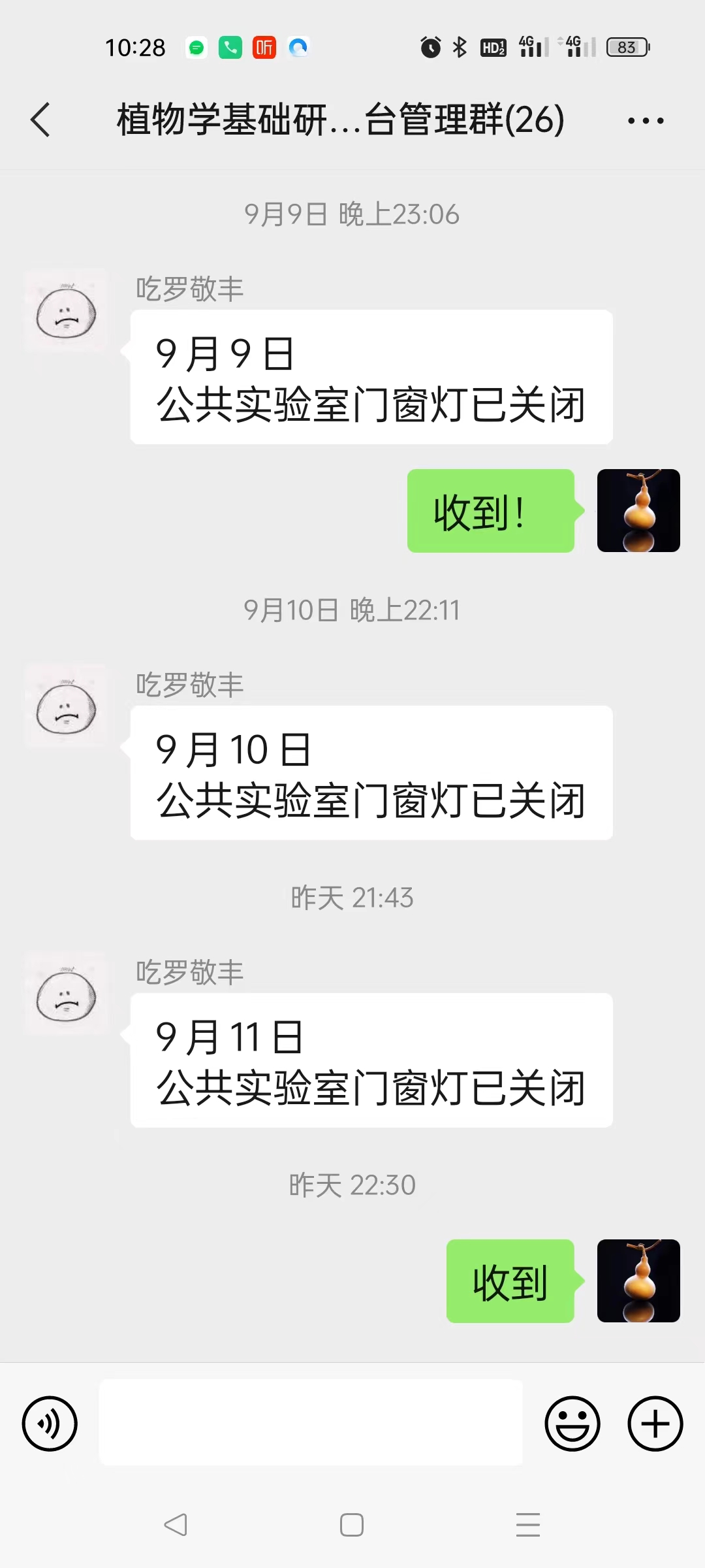 实验室兼职管理员肖佳雷向记者介绍,为了落实安全管理,各平台实验室的每个课题组都要指定一名组长,每天晚上都要巡查各个房间的安全情况,水电门窗是否关闭,仪器设备是否断电归位。肖佳雷表示:“每天晚上只有看到组长在群里汇报安全,我心里才能踏实。”每天早上,肖佳雷都会从第一个实验室走到最后一个实验室,仔细检查卫生打扫情况和使用安全情况。打扫不彻底的要在大群里点名询问,仪器设备使用后为关闭的也会第一时间找到使用人进行沟通。