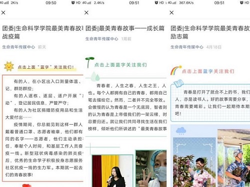通过学院网站、公众号等平台,开展党建宣传和引导,看似无形的“云宣传”,为基层党建注入了新鲜“血液”,带来了生机活力。为树立先进典型、弘扬青春正能量,学院团委分为“励志篇”“成长篇”“战疫篇”等栏目开展“最美青春故事”系列活动,以优秀学生党员分享个人的奋斗经历和感悟的形式,引导广大学生在学习榜样过程中不断汲取精神力量,推动学院学生思想政治工作全面发展。