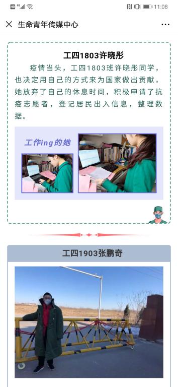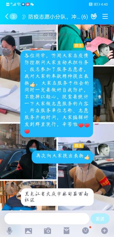 杜壮和其他辅导员一样,微信有很多学生分组:年级、班级、学生会、学生干部、学生党员……疫情来临之后,杜壮与每个组都召开过“云会议”,每天都会交流,因为除了从班级同学角度了解学生情况,学生所在的每一个组织也是掌握学生情况的重要来源,有时候还会获得更为准确的信息。这些群组里有一个组建时间最近的,就是“志愿服务小分队”群。杜壮所负责的学生中有5人响应号召、积极报名家庭所在社区承担志愿服务工作,杜壮每天都会和这5名同学联系,询问他们的工作情况、身体状况,交流分享怎样改进工作方式和疫情防控常见问题。他每天都会提示大家自我防护,鼓励大家保持积极阳光的心态,这些同学的志愿服务工作在社区收获一致好评。