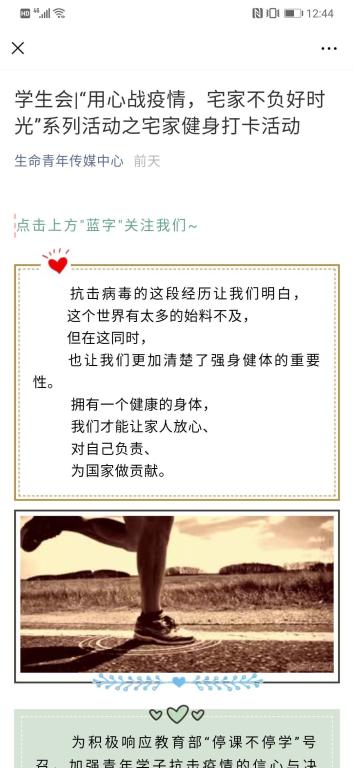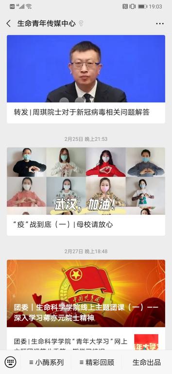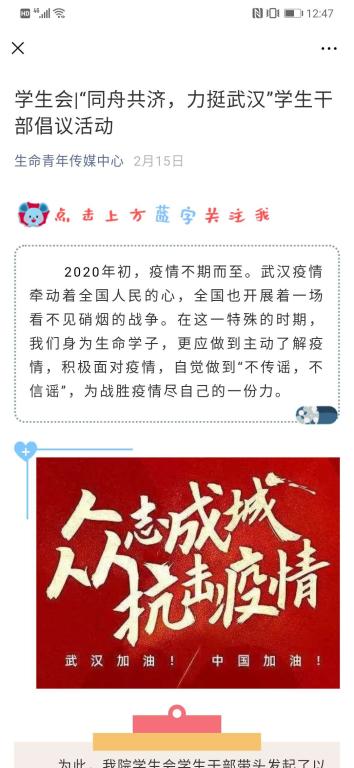 为了丰富学生的宅家时光,增进同学之间的感情,疫情期间学院各学生组织发起了多项“云活动”:有科普知识的科学小常识推送,有展示学生风采的志愿者先进事迹展播,有互动拍摄制作的2018级秦鹏春班祝福视频、生命学子为疫情防控加油短视频、学生线上打卡报平安活动,还有发挥大家文体特长的“同舟共济,力挺武汉”、“同心战疫情,宅家不负好时光”等线上活动,通过这些线上活动,在这个长时间的假期里保持学生集体的凝聚力,增强学生的归属感、向心力。