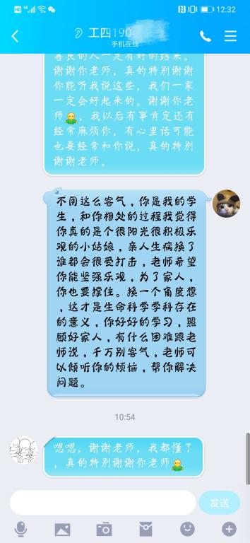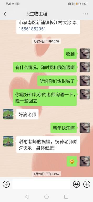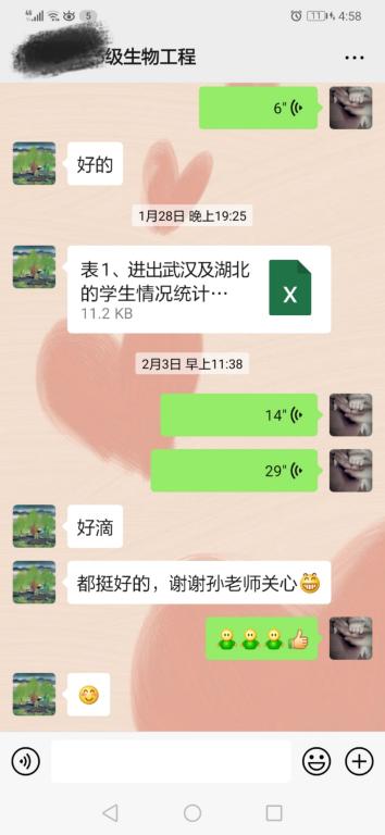 “谢谢老师,我一切安好!”这是自1月25日以来,最温暖人心的一句话,也是家住湖北孝感的小涂每天早上接到辅导员孙珠红问候重复了41次的话,更是孙珠红负责的5名湖北籍学生每天发给她的话。小涂腊月二十八从北京实习,经武汉返乡,疫情爆发后,孙珠红多次对小涂进行“云家访”,及时掌握小涂及家人的近况,鼓励他们科学面对、放松心情,得知小涂的毕业设计进度,便帮助她协调相关老师进行学业指导。通过一次“云家访”得知新冠肺炎疫情给原本不富裕的家庭增添了经济负担后,孙珠红除了给学生发红包表示关心,还帮助她申请了学校的新冠肺炎疫情防控专项困难补助。目前,小涂同学和家人均身体健康,时常给孙珠红发来与家人的合影报平安。