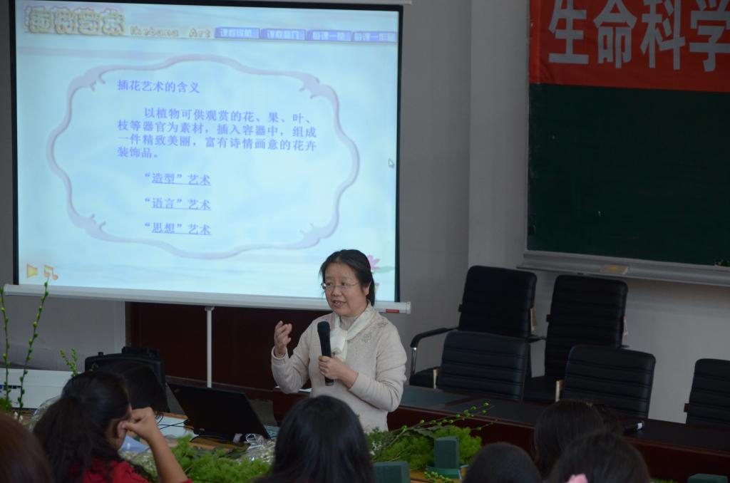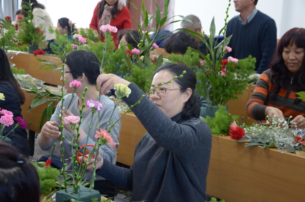 培训会正式开始,首先刘教授给大家讲授了插花艺术的含义,带领大家欣赏了不同风格的插花艺术。接下来是插花实践活动,老师们纷纷上前台取用自己喜欢的花卉,在刘教授的指导下自由发挥,进行创作,还不时观摩其他老师的作品,十分惬意。最后,每位参加活动的老师都收获了一份满意的插花作品,并合影留念。