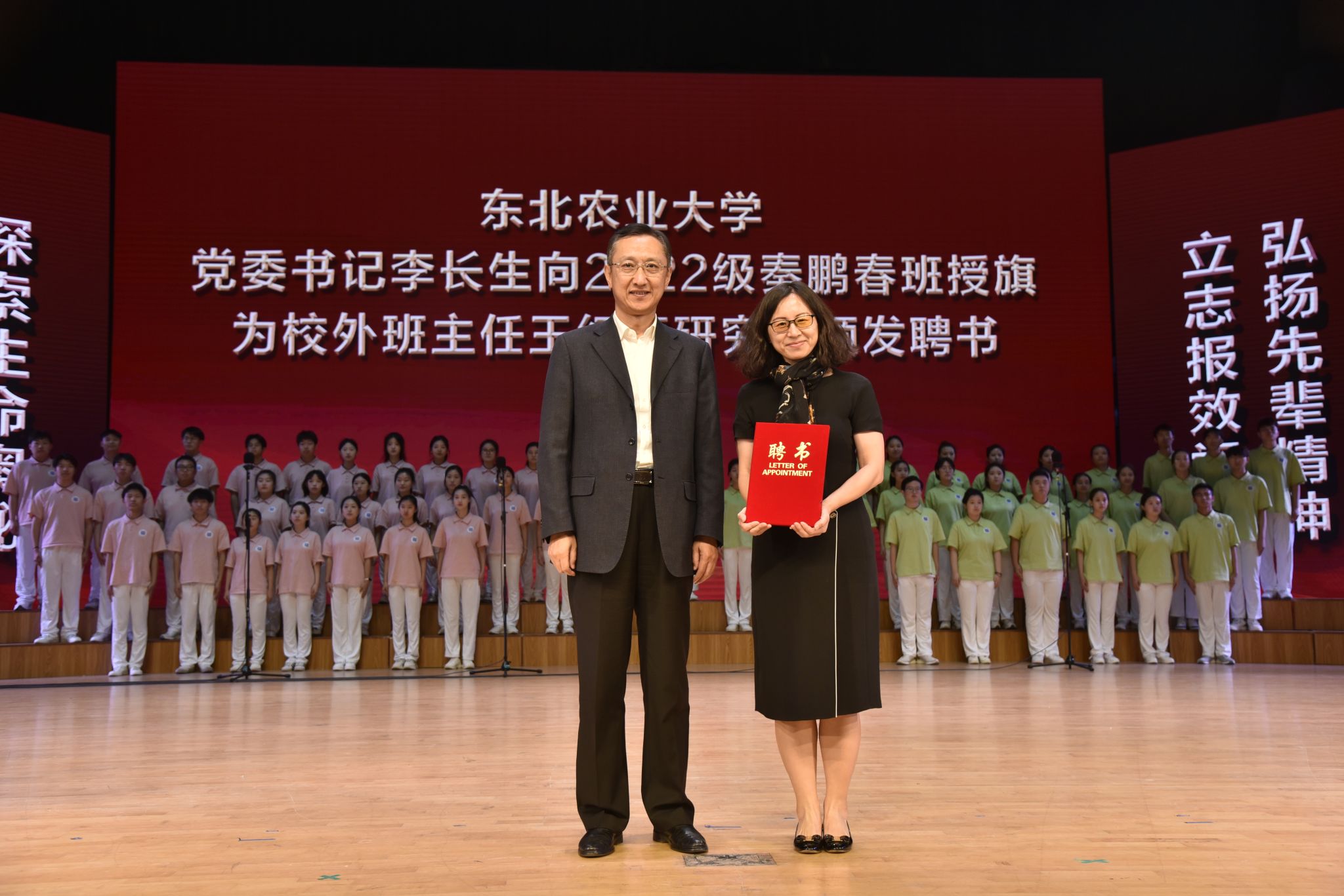 校党委书记李长生为2022级“秦鹏春班”授旗并为校外班主任、中国科学院动物研究所干细胞与生殖生物学国家重点实验室主任王红梅研究员颁发聘书。