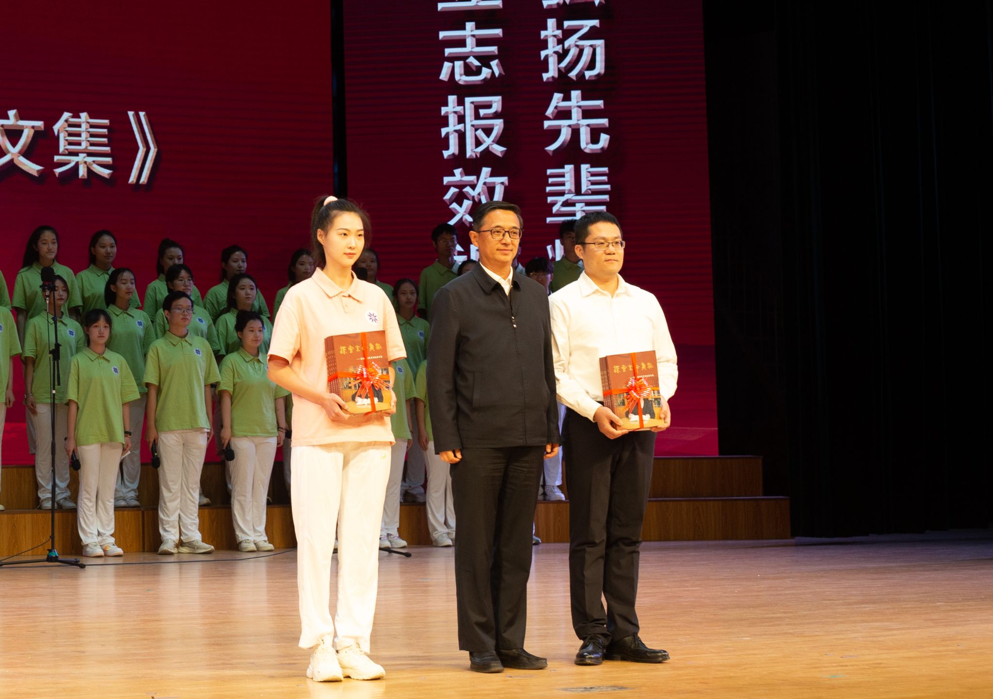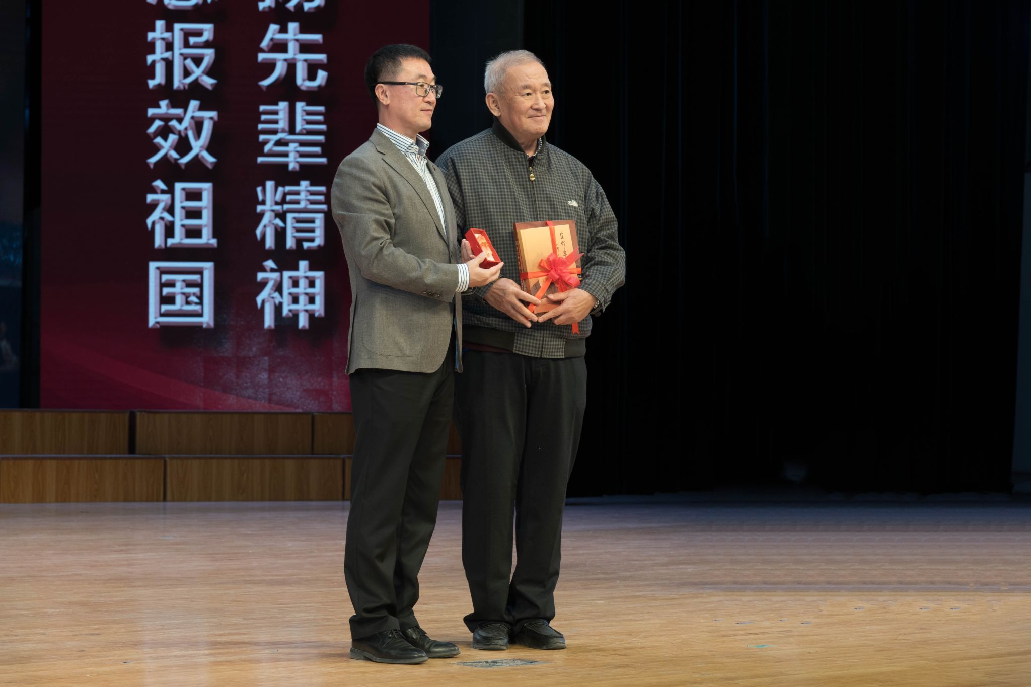 校党委副书记王泽方为“秦鹏春班”和秦鹏春科研创新奖学金获奖者代表赠送《秦鹏春先生百年诞辰纪念文集》。