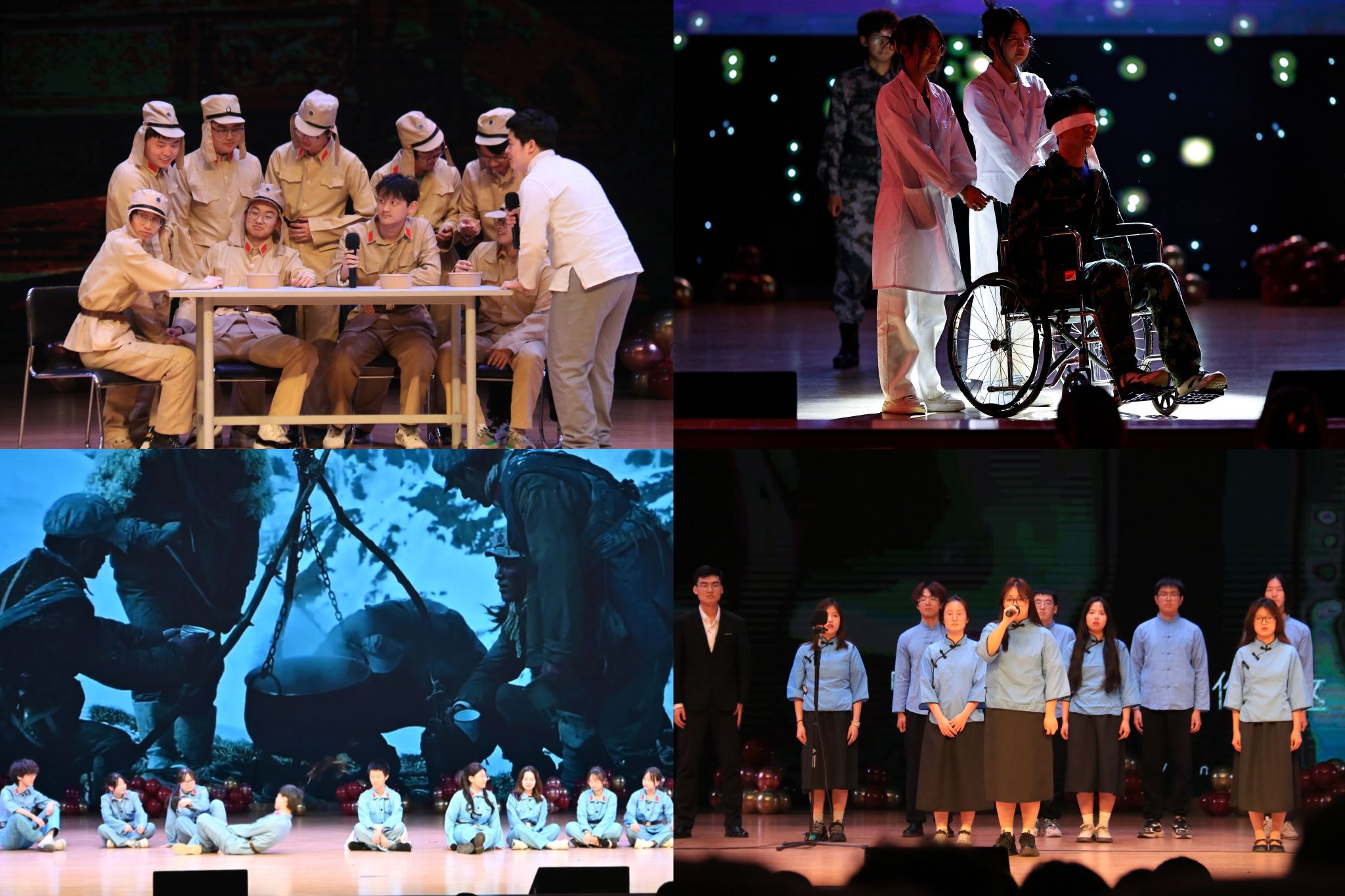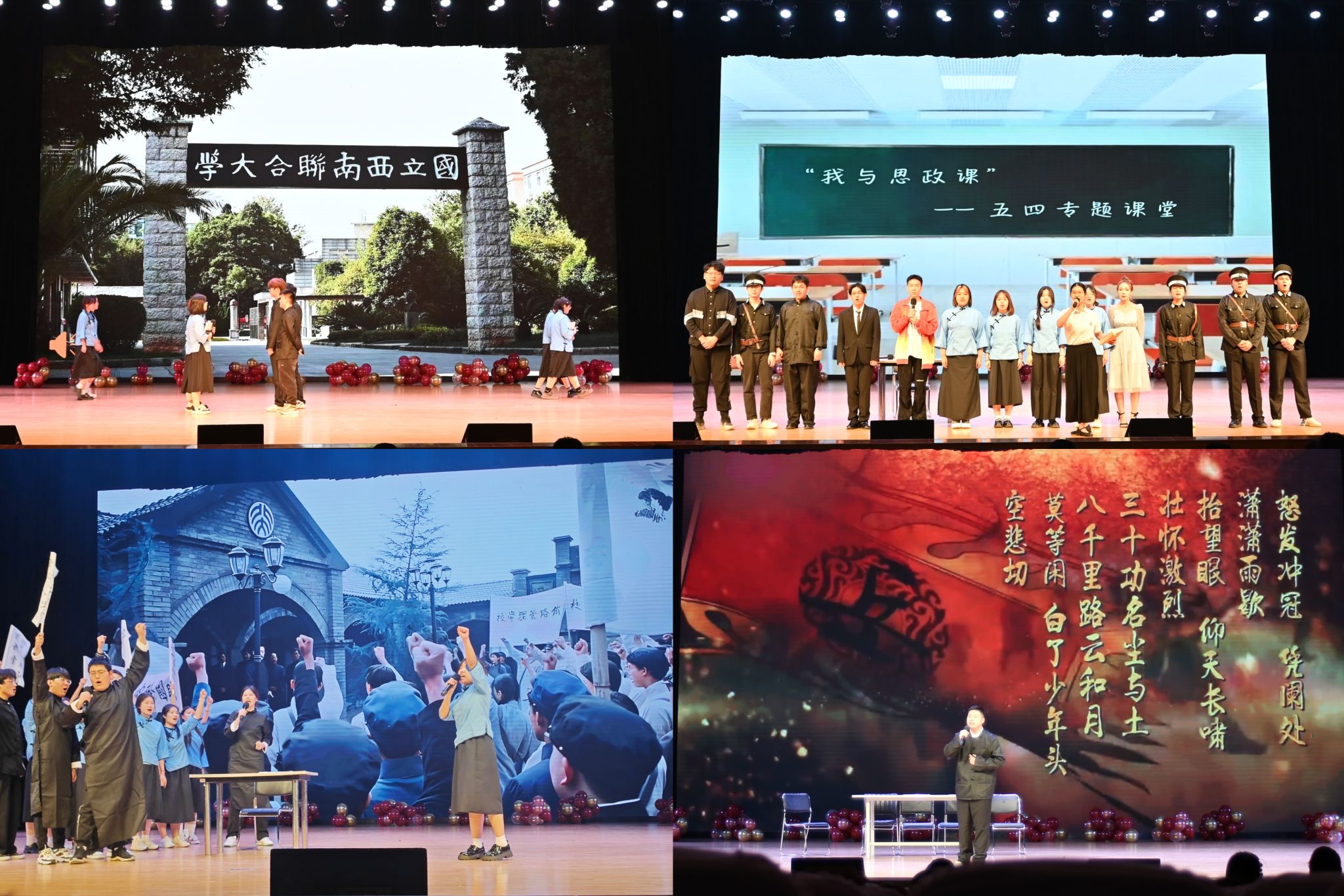 舞台剧《西南联大的同学们》、《穿梭》、《外交风云1919》、《满江红》描绘了一批热血澎湃的青年擎起真理的火炬,历经艰险开辟经天纬地事业的故事,带领大家回顾那场拯救民族危亡、捍卫民族尊严、凝聚民族力量的伟大运动。