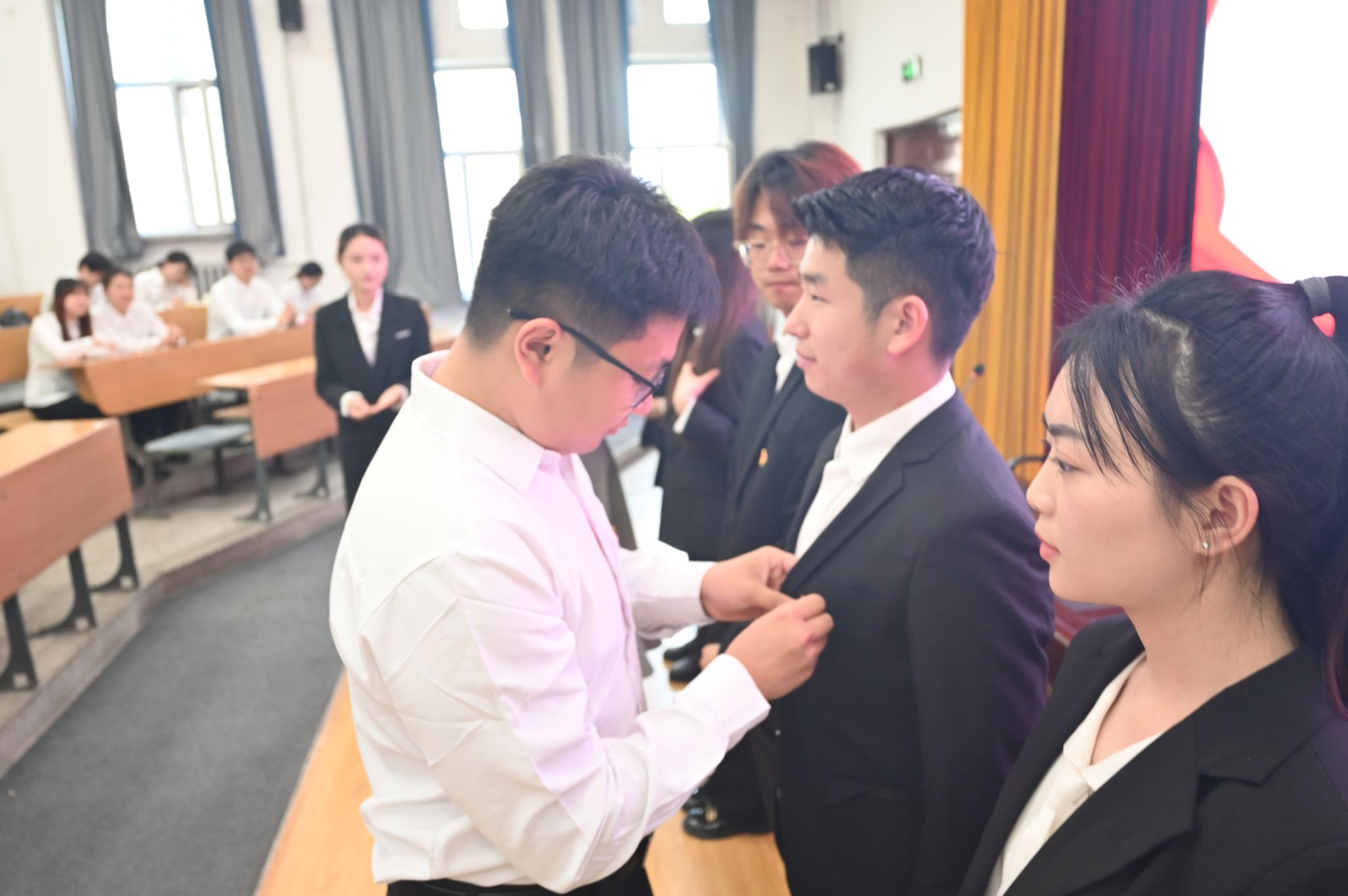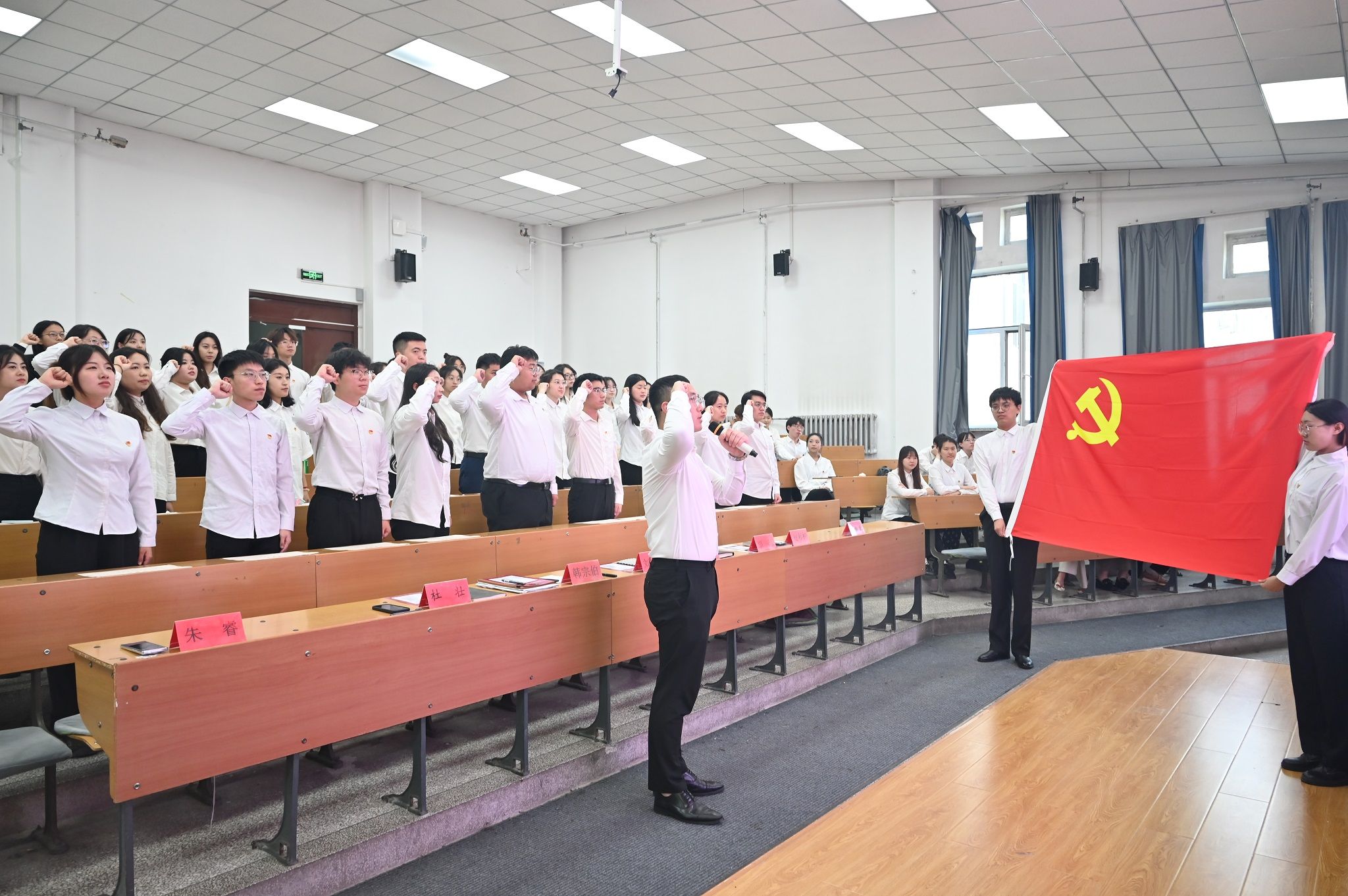随后,辅导员韩宗伯宣读了2024年上半年新发展党员名单,辅导员赵彩桐、白舜禹为新党员代表佩戴党员徽章。辅导员杜壮带领全体新发展党员面向党旗庄严宣誓。