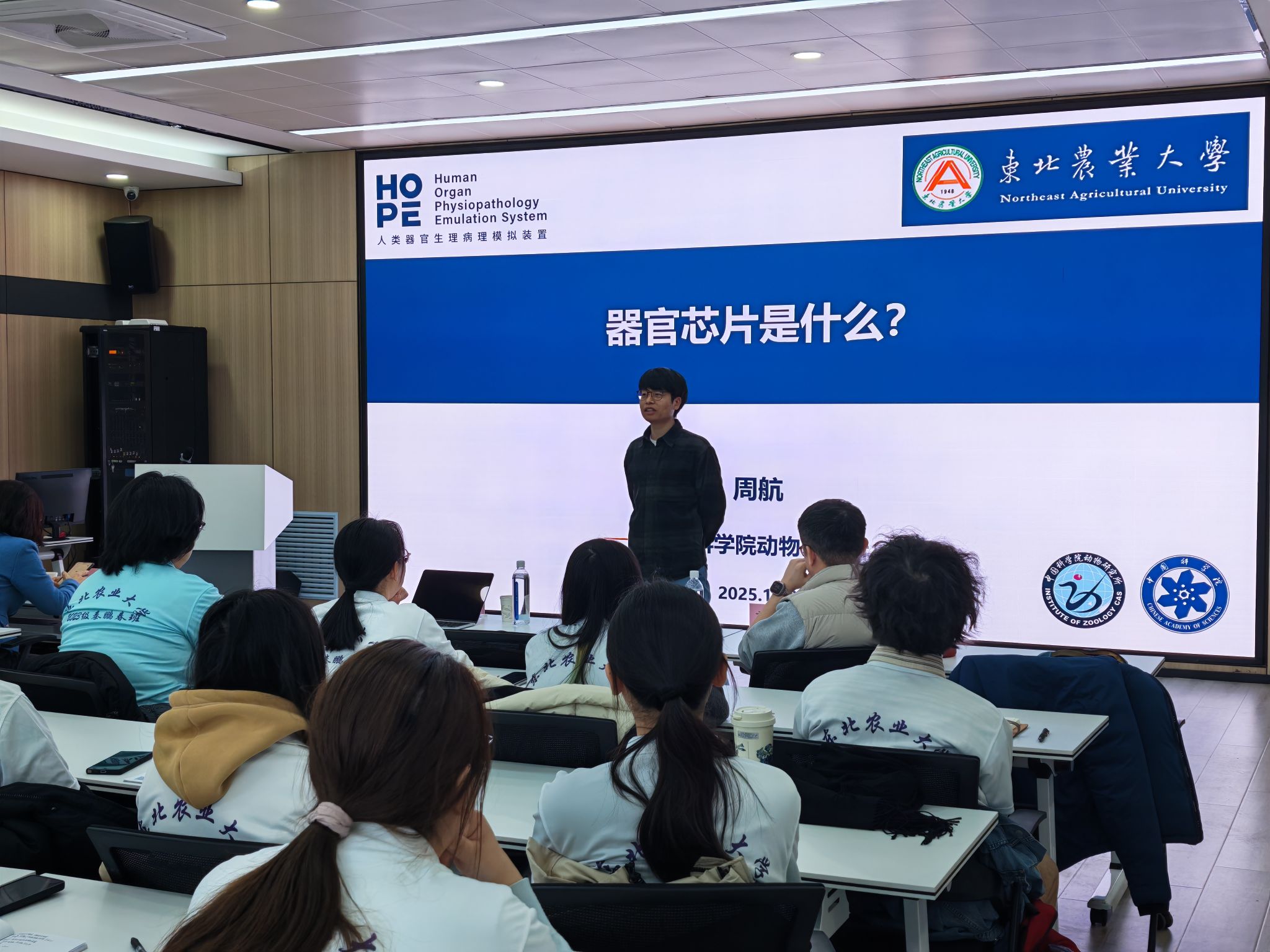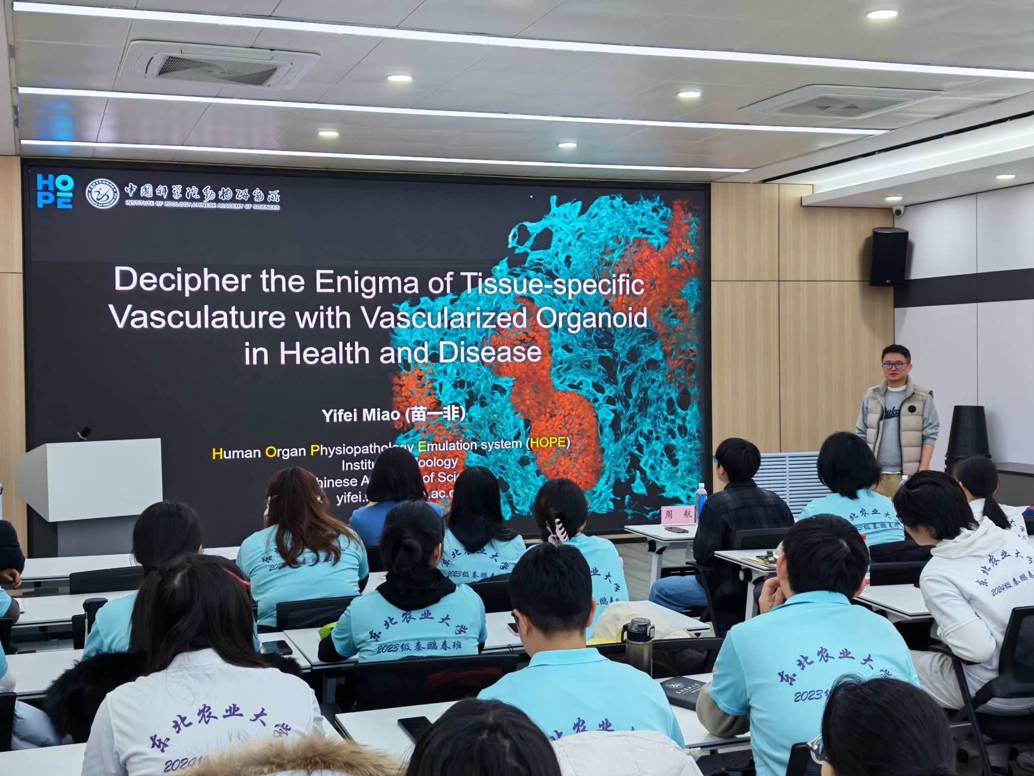会上,苗一非以“利用血管化类器官解析健康与疾病状态下组织特异性血管系统的奥秘”为题,详细地介绍HOPE装置的设计理念、建设目标及其“造元件、组系统、仿功能、控运行”的四大功能。他聚焦心血管与血管系统研究,深入浅出地介绍类器官的定义、特征以及在疾病模型开发中的应用。周航讲解了器官芯片的发展历程、核心要素、开发理念,通过对比传统模型优势,举例说明其在生理病理模拟、药物筛选中的应用场景。同时,两位老师结合自身从求学到立业的成长轨迹,向在场学生分享了自己在科研探索道路上的心得感悟。